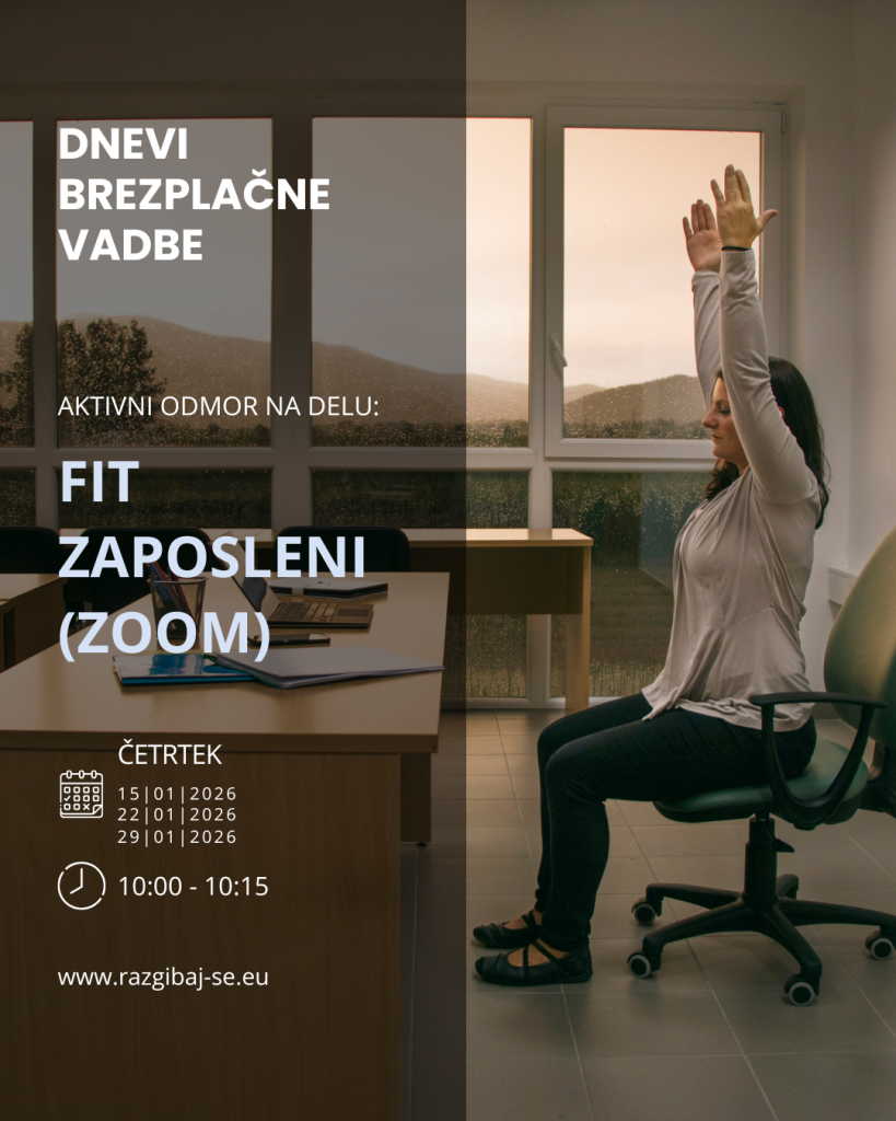 V okviru Razgibaj se vadbenega centra želimo delček sprostitve prenesti tudi v podjetja, zato v januarju vsak četrtek med 10.00 - 10.15 uro organiziramo brezplačne aktivne odmore na daljavo, ki bodo potekali preko portala zoom.